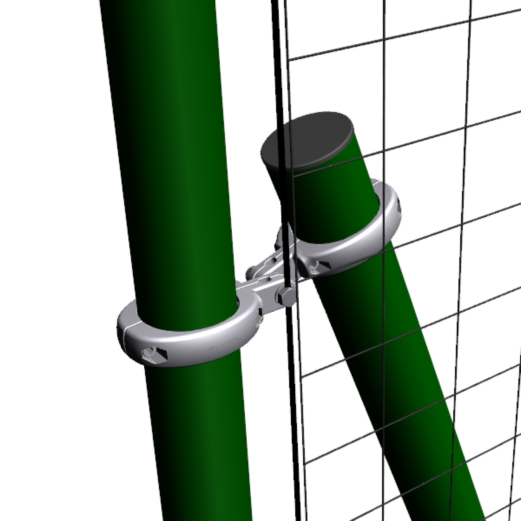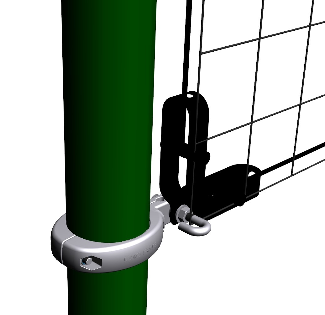 La BRIDE est une pièce moulée en zamac utilisée sur les poteaux ø 60, 90 et 102 mm pour un assemblage SANS SOUDURE d'un pare-ballons ou d'une clôture. La bride avec poulie est utilisée pour la tension du filet, la bride avec crochet est utilisée pour la tension du fil tendeur avec les raidisseurs. La liaison (SANS SOUDURE) entre la Jambe de force et le poteau est assurée par deux brides.