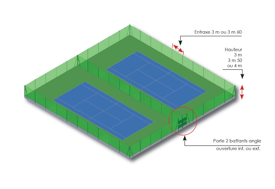 Clôture de court de tennis doublée par la largeur (36 x 36 m) comprenant 2 portes passage de 1 m 20. Clôture composée de poteaux en acier galvanisé, thermolaqué dont la section est définie suivant une étude des vents : ETUDE CERTIFIEE PAR L'APAVE