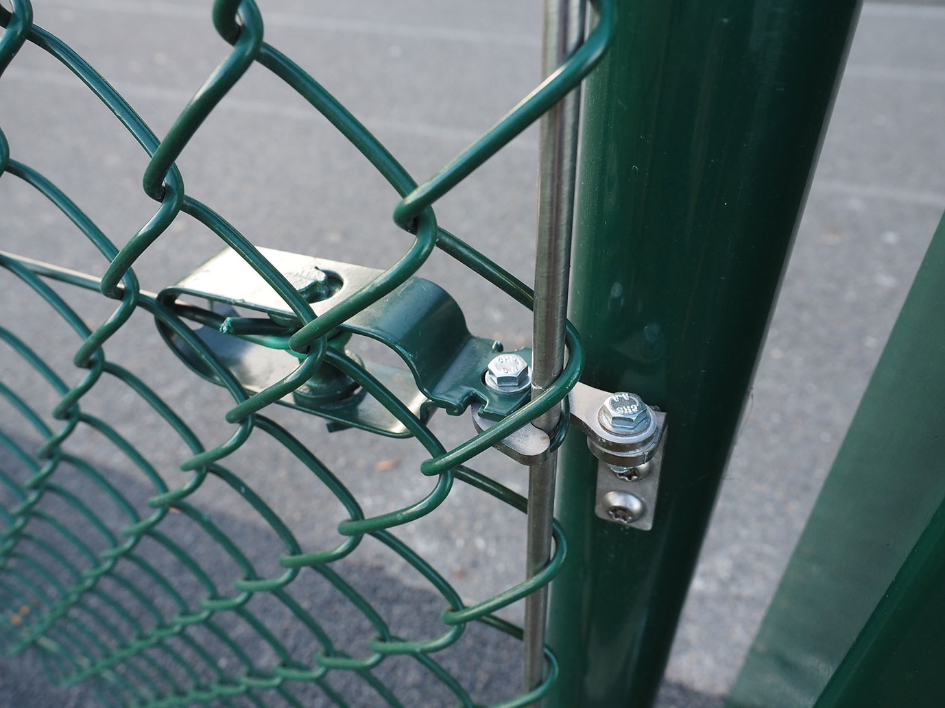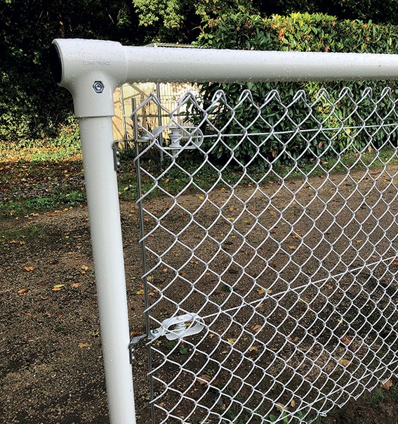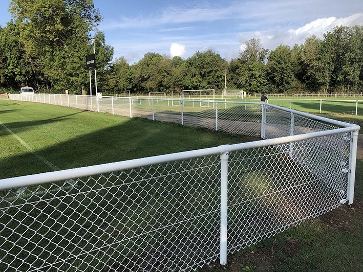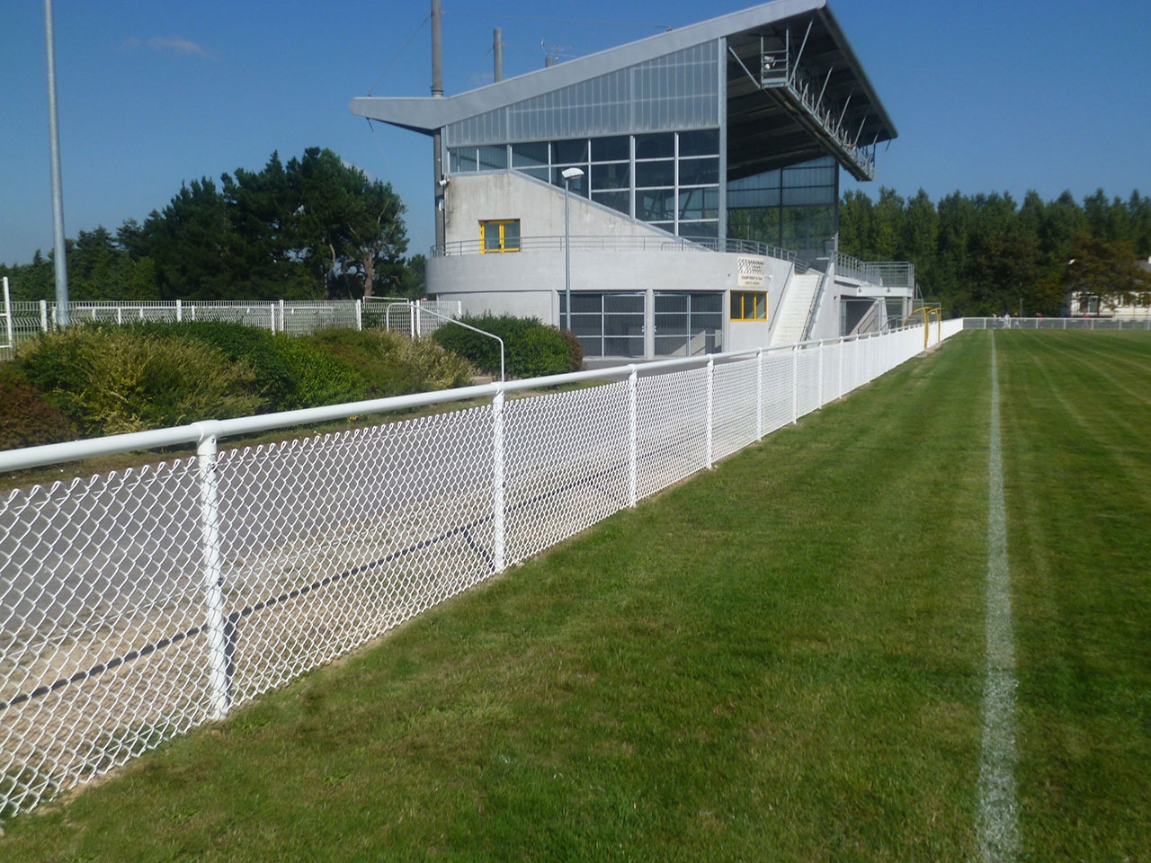 Main-courante composée de poteaux et de lisses ø 60 mm assemblés par un "Té" coquille moulée en Zamac. Remplissage grillage simple torsion. Mode de fixation du grillage : "CLOMO TECH" orientable, cette fixation permet de s'adapter à plusieurs configurations de terrain.