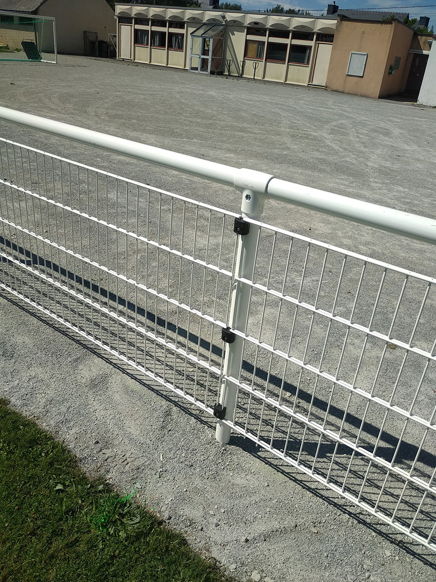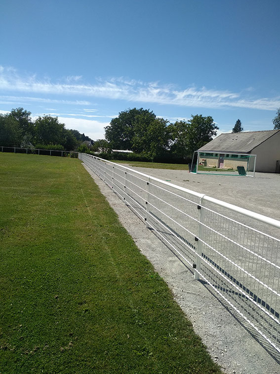 Conception et adaptétion d'une clôture main courante de 59 ml au stade de Languidic. Clôture composée de panneaux rigides en treillis soudés et d'une porte 2 battants d'une ouverture de 4 m.