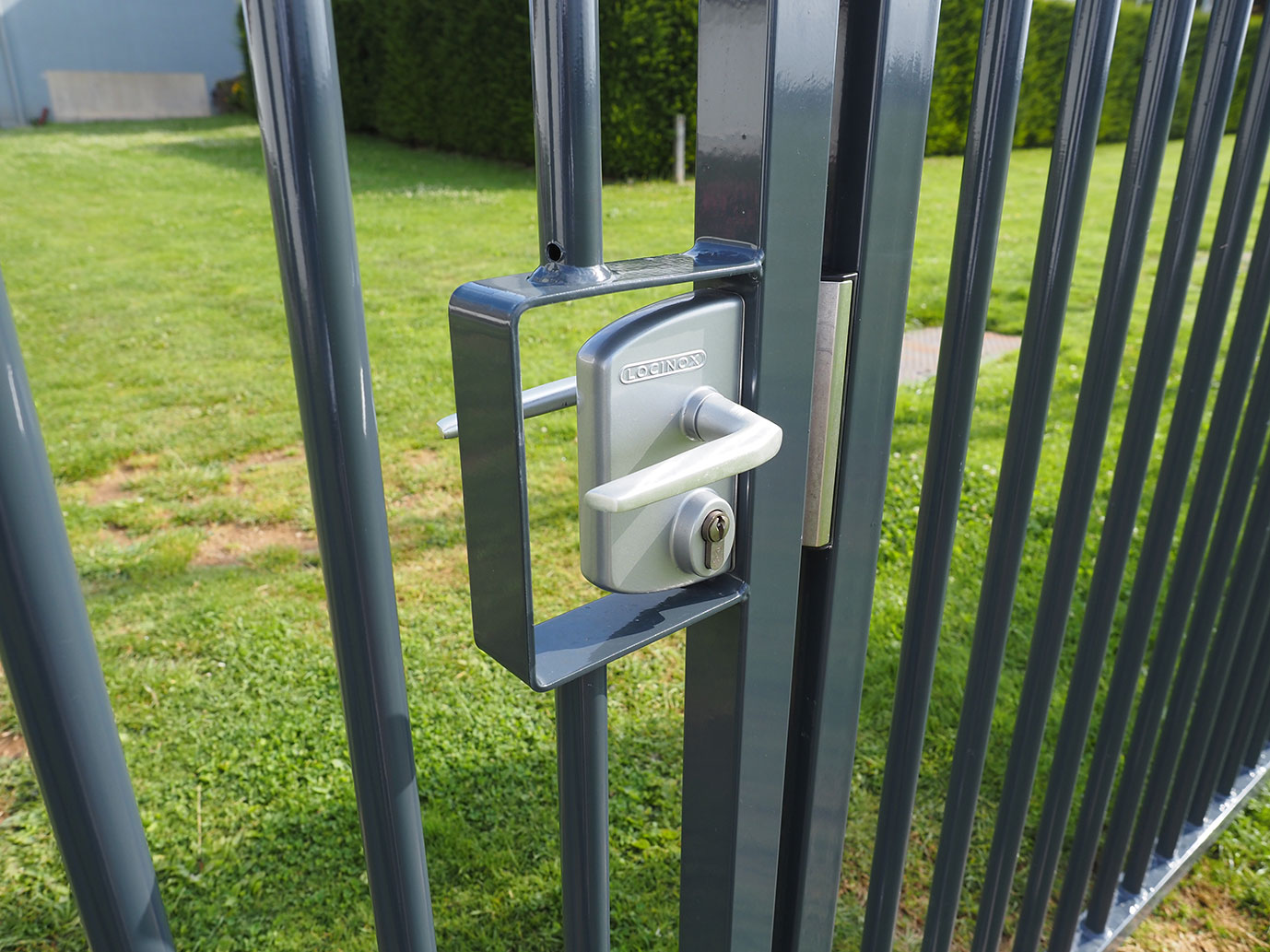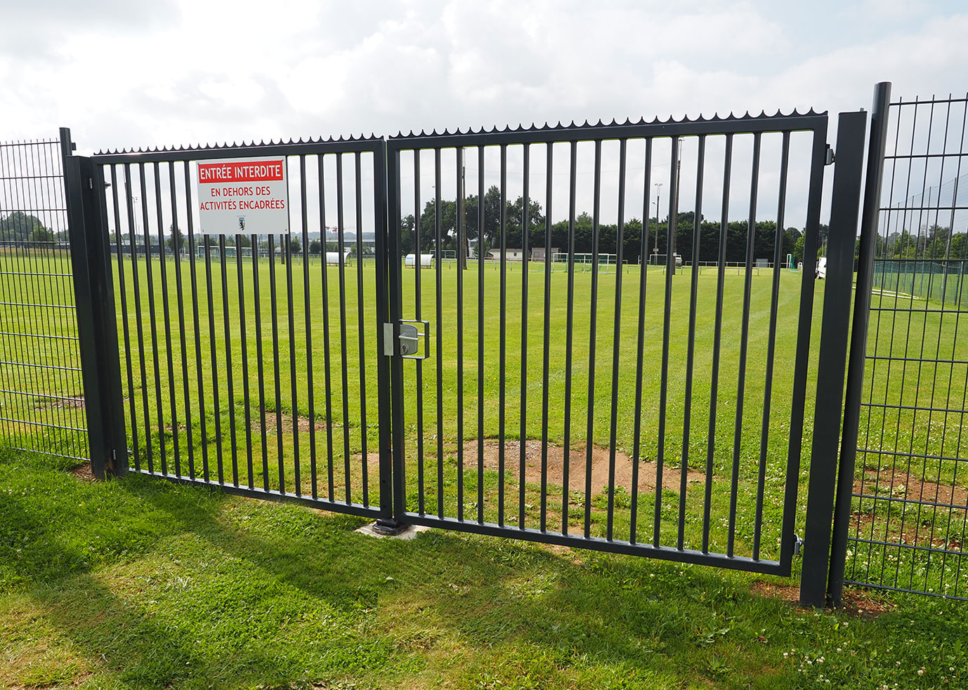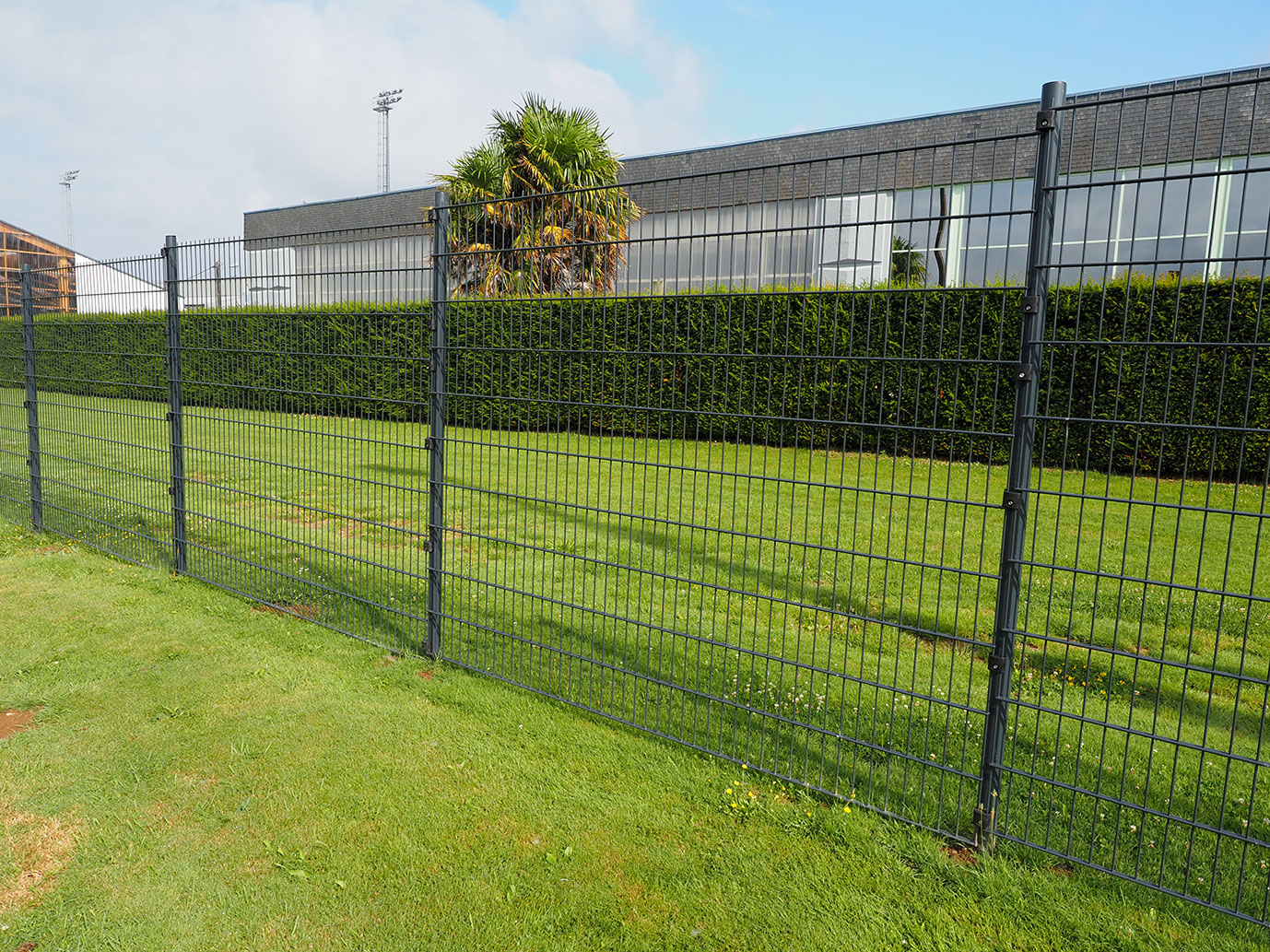 Aménagement des terrains de football avec une clôture en panneaux treillis soudés dotée d'un pare ballons aux endroits les plus prisés par le ballon. Un ensemble dans un coloris gris anthracite, ensemble harmonieux.