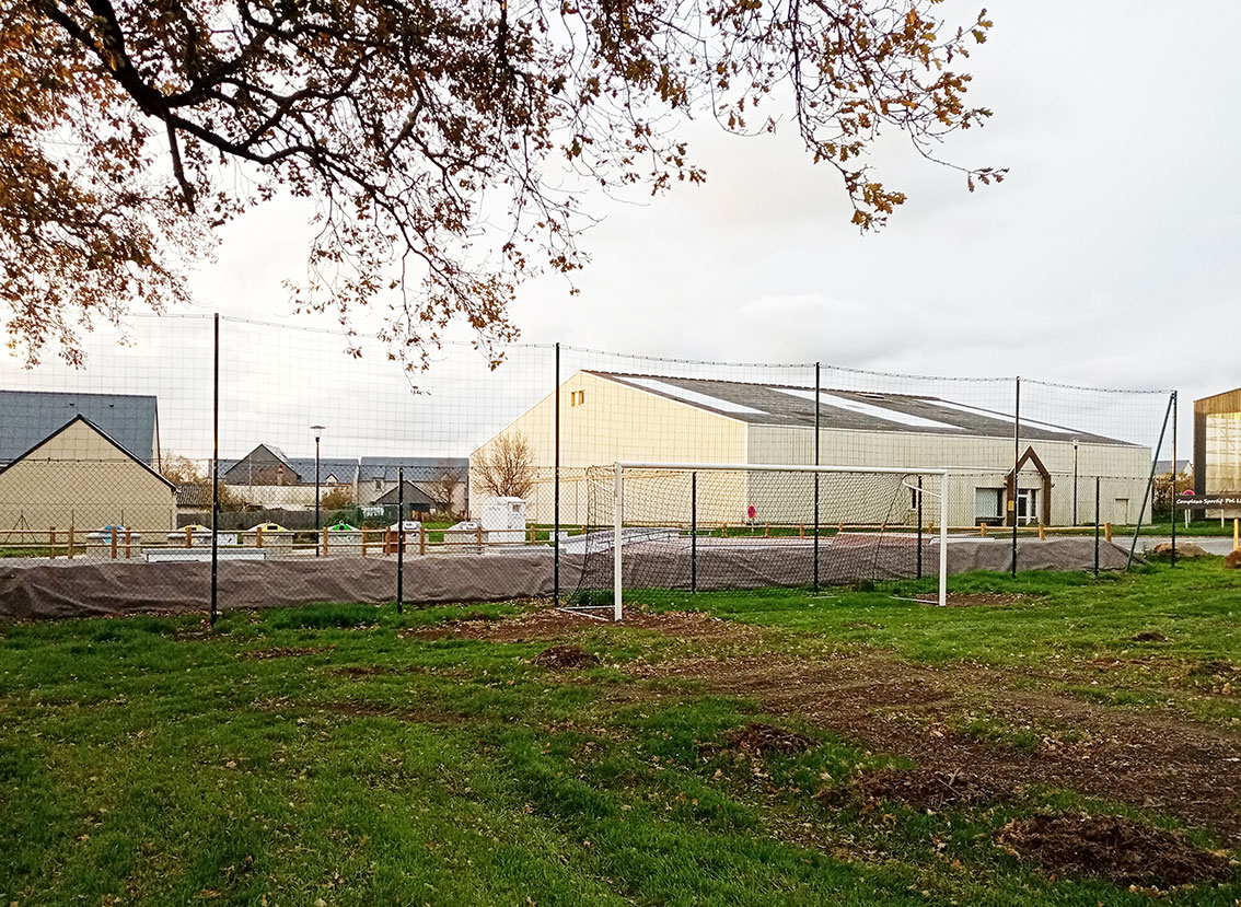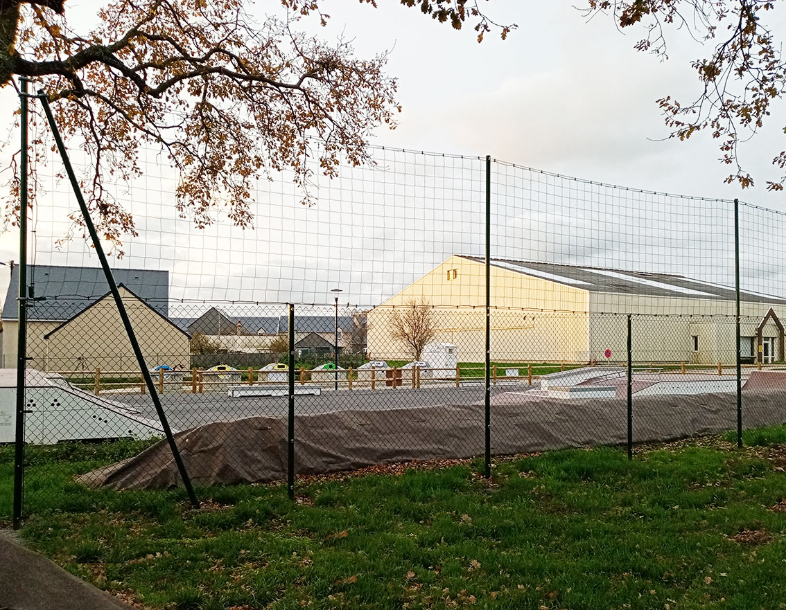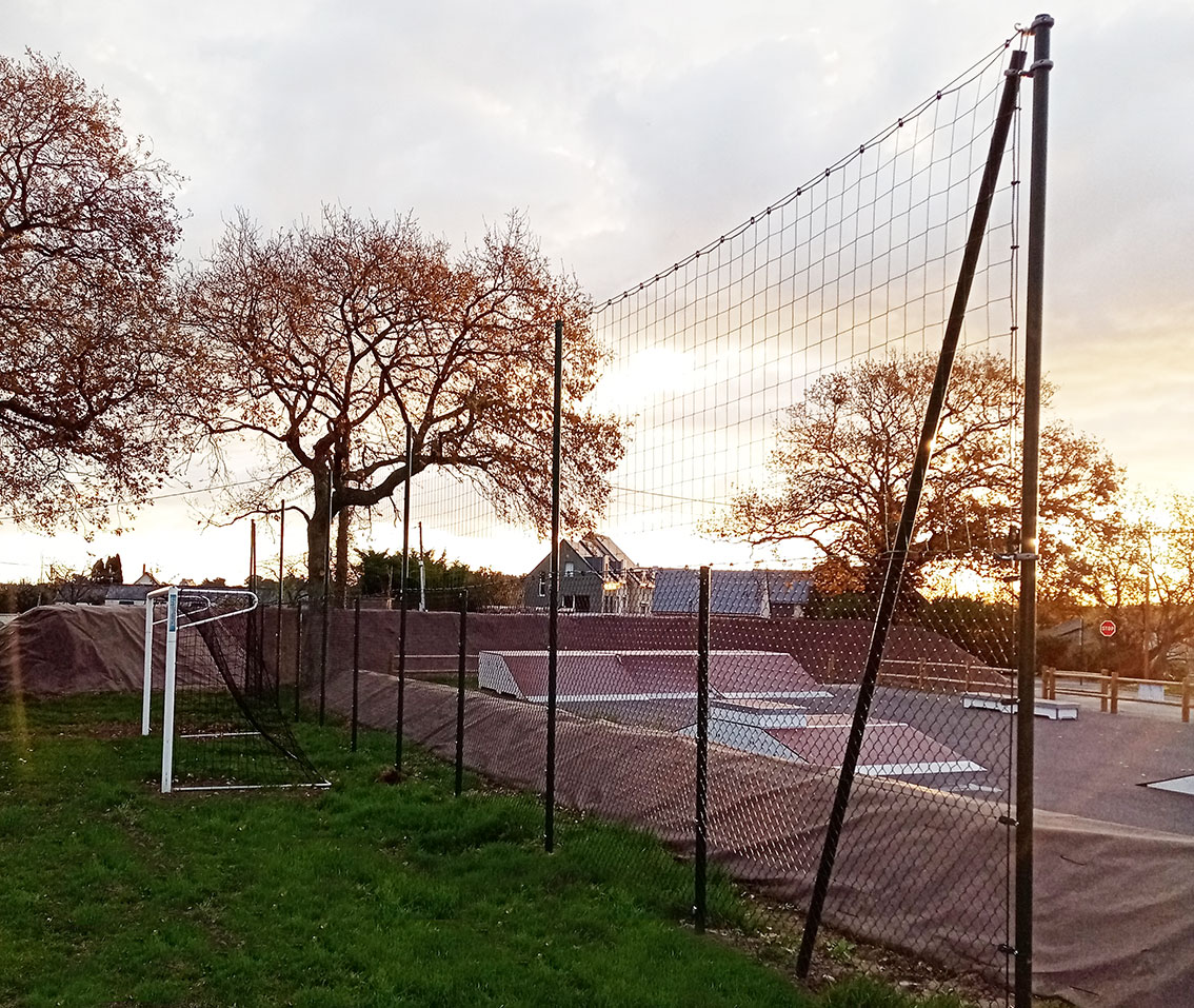 Fabrication et installation d'une clôture pare-ballons de 26 ml et d'une hauteur hors sol de 4 m. Remplissage d'un grillage simple torsion en partie basse et d'un filet maille 140 mm en partie haute. Idéal pour protéger et séparer deux espaces de jeux distincts comme ici entre le statepark et le terrain de football.