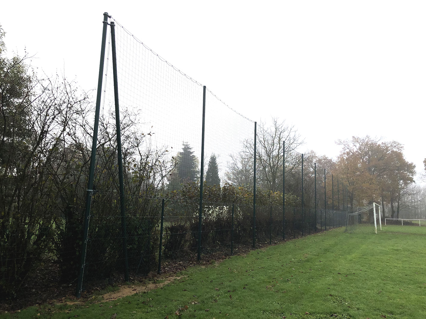 Installation d'un pare-ballons d'une longueur de 50 ml et d'une hauteur de 6 m. Remplissage grillage (2 m) en partie basse et rempissage filet (4 m) en partie haute.