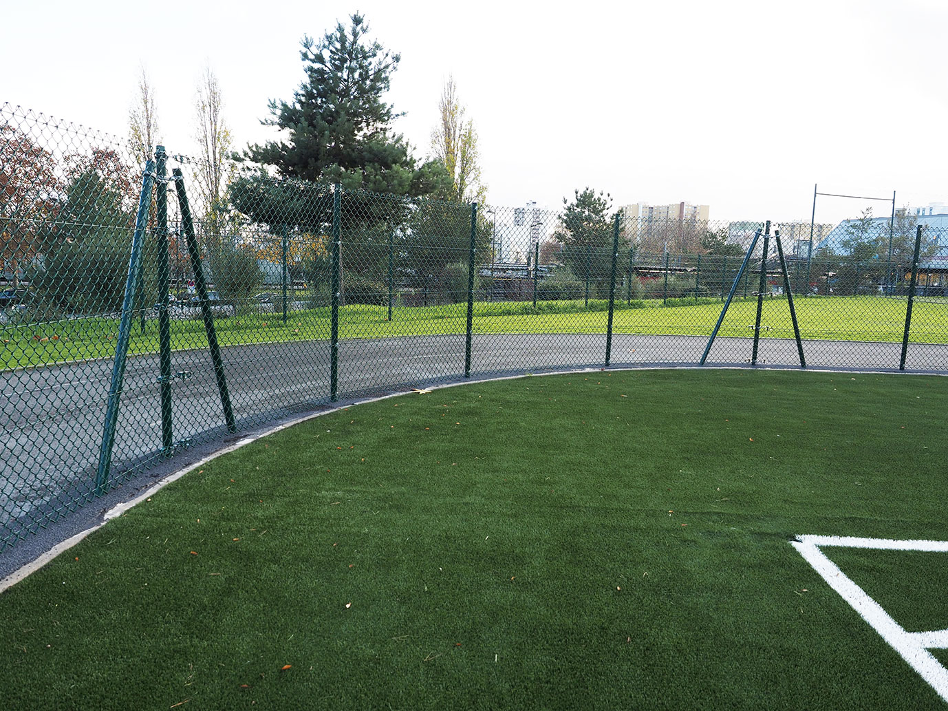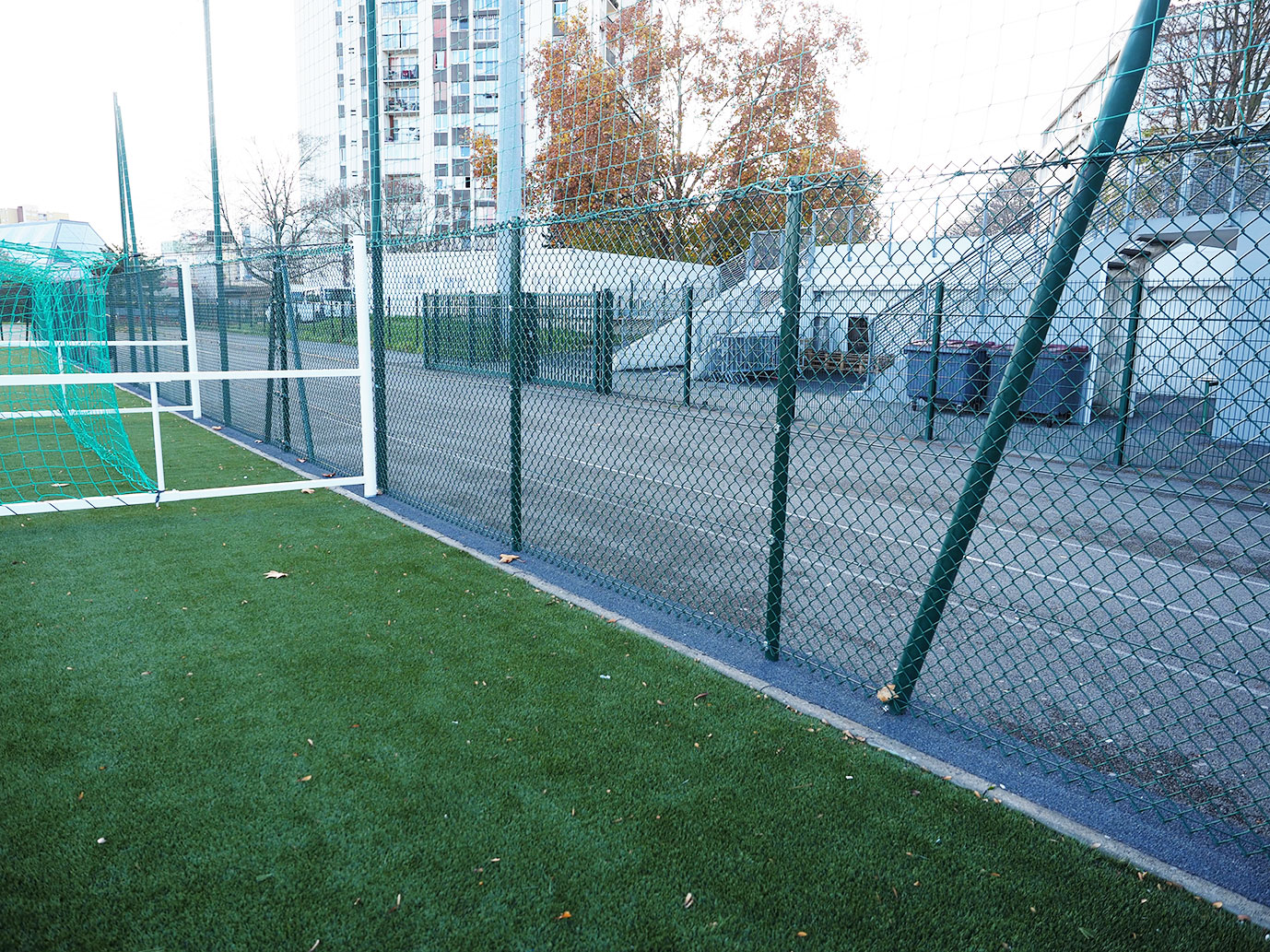 Aménagement d'un terrain de football composé de buts de football rabatables A8 et d'abris de touche aluminium longueur 5 m ; le tout clôturé d'un grillage simple torsion hauteur 2 m avec portails et portillons.