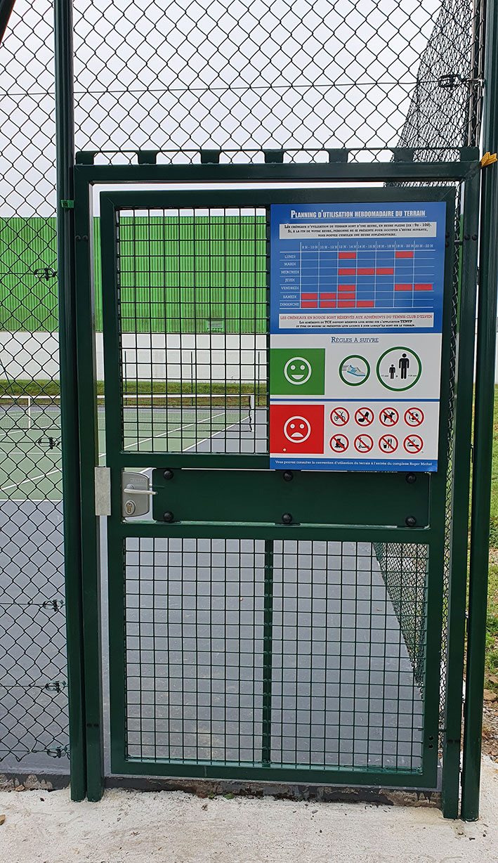 Aménagement d'une clôture de tennis court simple avec une porte 1 battant dans angle.
